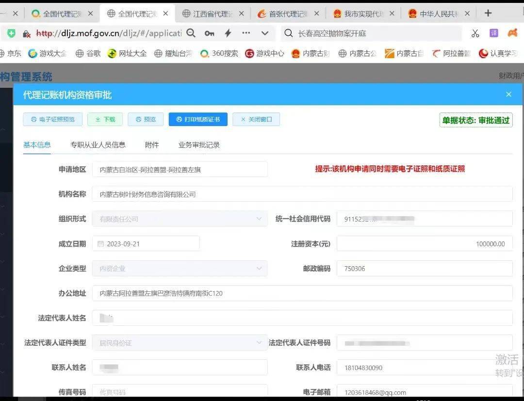 太阳集团官网登录入口阿拉善左旗财务局发出首张代劳记账许可证书电子证照